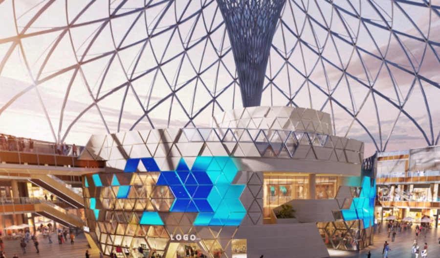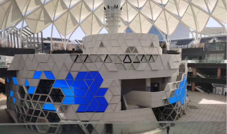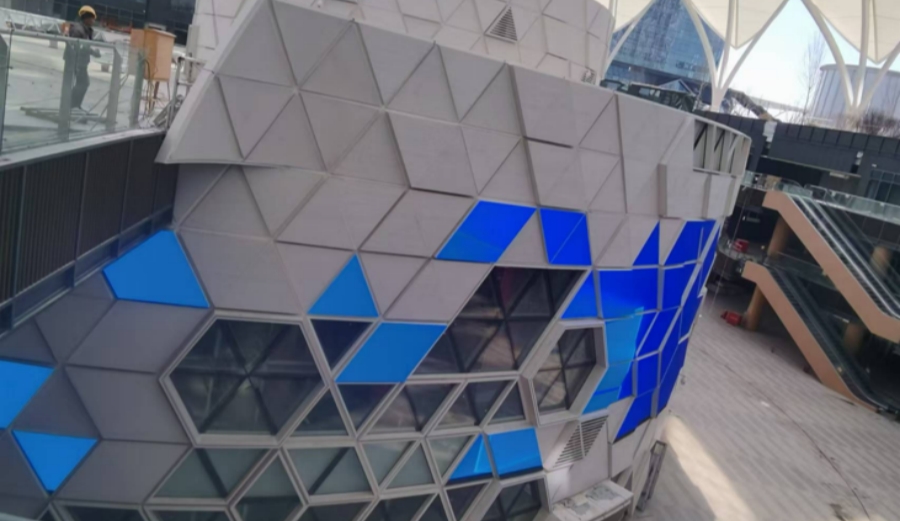 该项目位于商业中心共享空间穹顶下部,维护材料主要采用魔晶石,玻璃幕墙及LED显示屏组成。圆形双曲面结构,用三角形折线化处理。本项目主要构件均以三角模块化处理,工厂模块化生产,现场整体吊装。项目所用刚性节点各枝夹角均从模型中提出,在局部范围内拟合处理,无论从施工精度、工期及施工质量都得以保证。