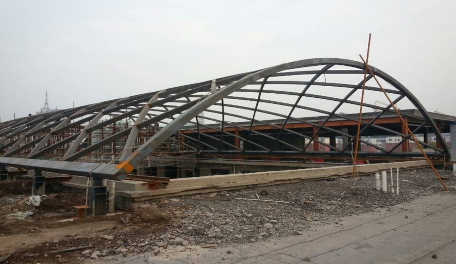 该项目为旧建筑改建工程,跨度18.9米,原结构未考虑增加采光顶后产生水平力,我司采用交叉位置刚性节点,反起拱,工厂拼装实验,再结合各种工况下计算,单侧采用滑移支座,无论是从受力还是施工周期上都得到保障,为后续曲面空间结构积累经验。