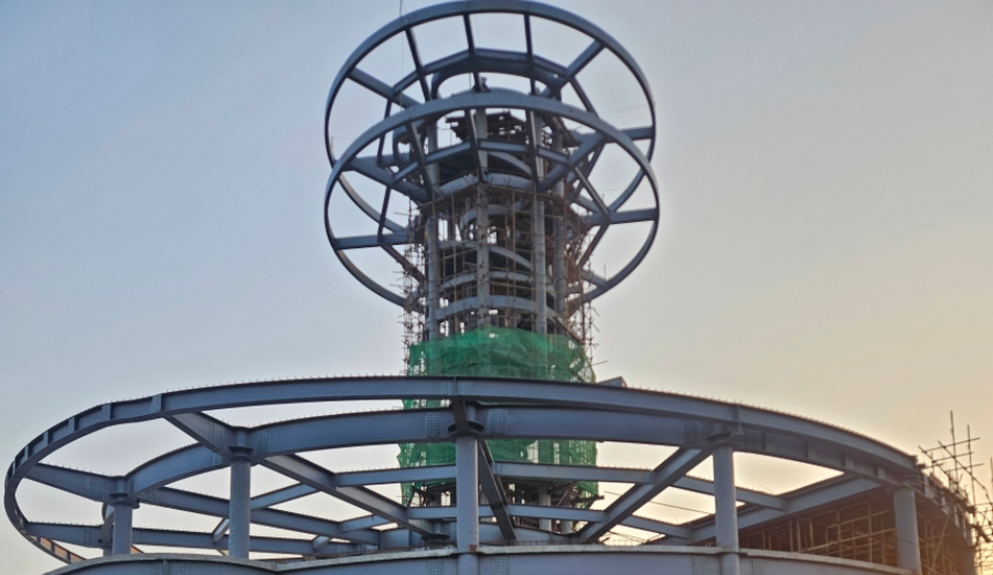 当前为在施状态,主要内容为钢构主体、幕墙、雨棚、观景台、及咖啡厅屋等。